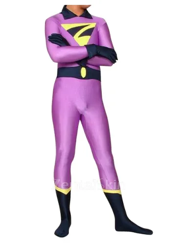| Shown Color | Purple,Black | Detail | Multicolor lycra spandex zentai costume,purple with black,black belt, yellow and black decoration on the chest. |