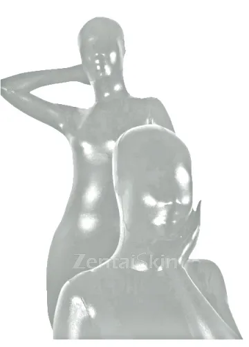 | Shown Color | Images Show Color | Detail | A full body covering catsuit with shiny metallic material adopted,the catsuit is in silver white colored with and hood attached. Distinctive finger parts design. We supply customization service accord |